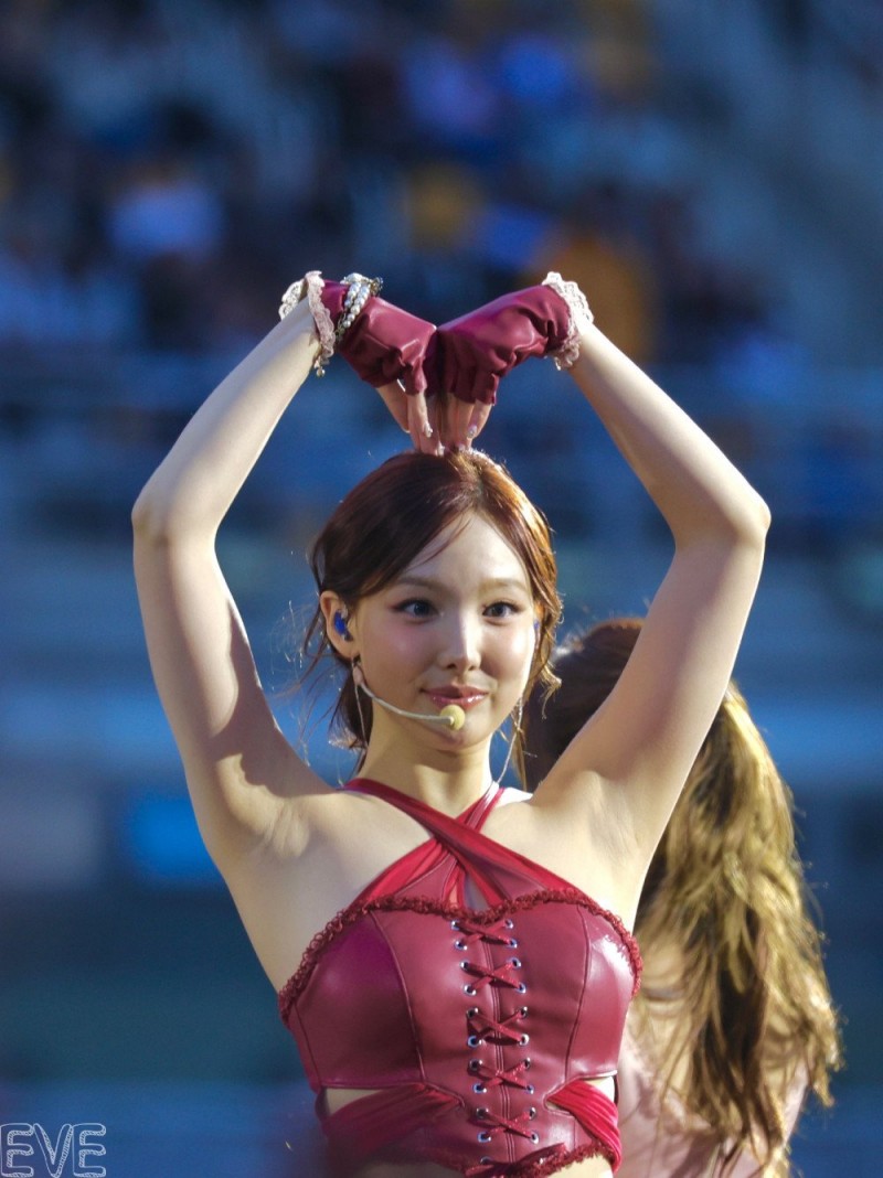 빨간 가죽 홀터넥...머리 위로 하트하는 나연