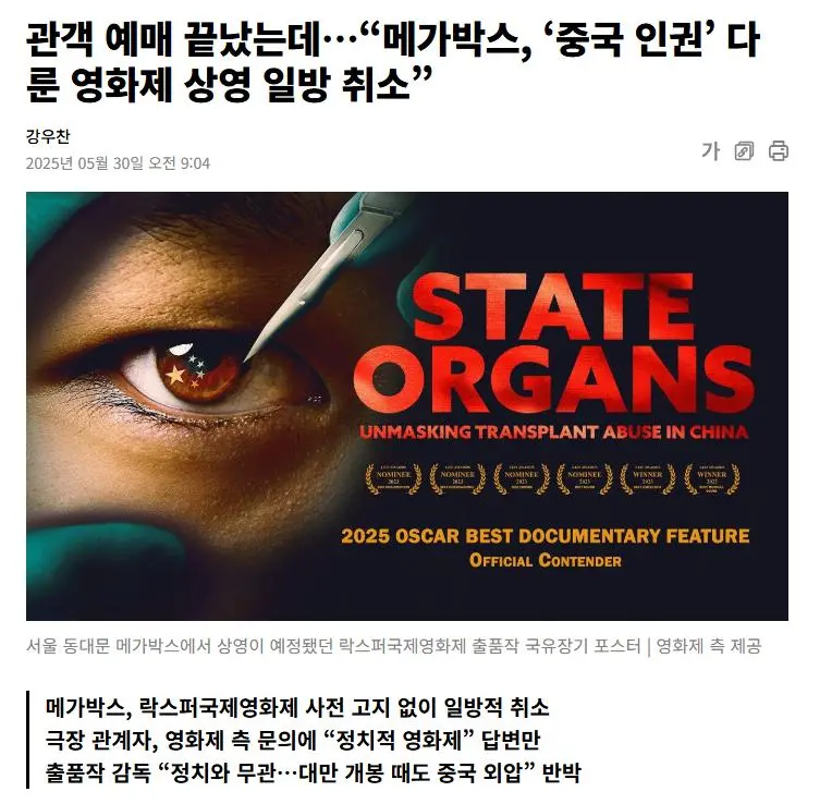 메가박스 중국 인권 다룬 영화 일방 취소