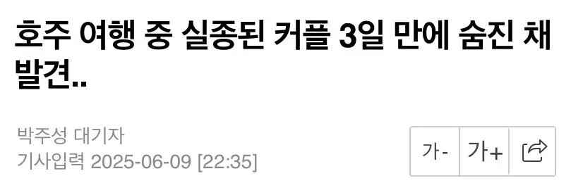 호주여행중 실종된 한일커플, 3일만에 숨진채 발견