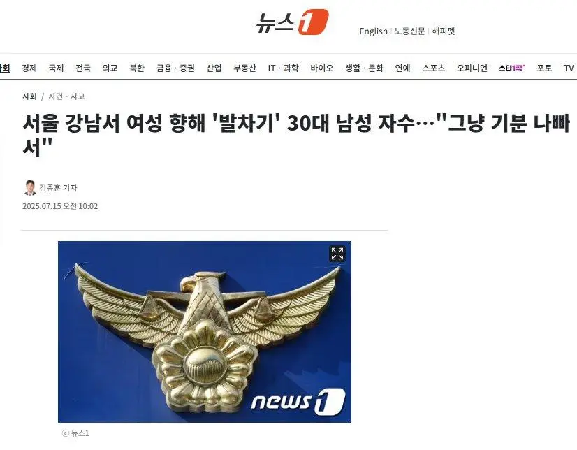 https://www.news1.kr/society/incident-accident/5846404 서울 강남 길거리에서 처음 보는 피해자를 발로 차고 달아난 남성이 경찰에 자수했다.