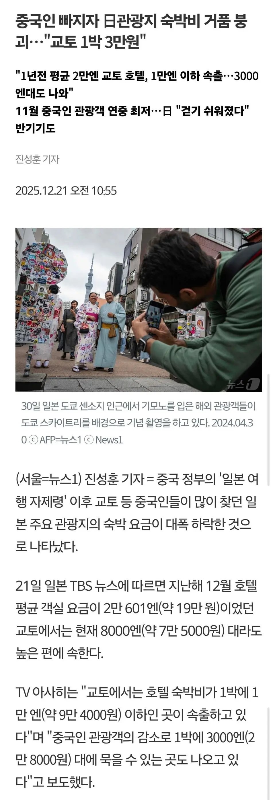 중국인 빠지자 日관광지 숙박비 거품 붕괴…"교토 1박 3만원"