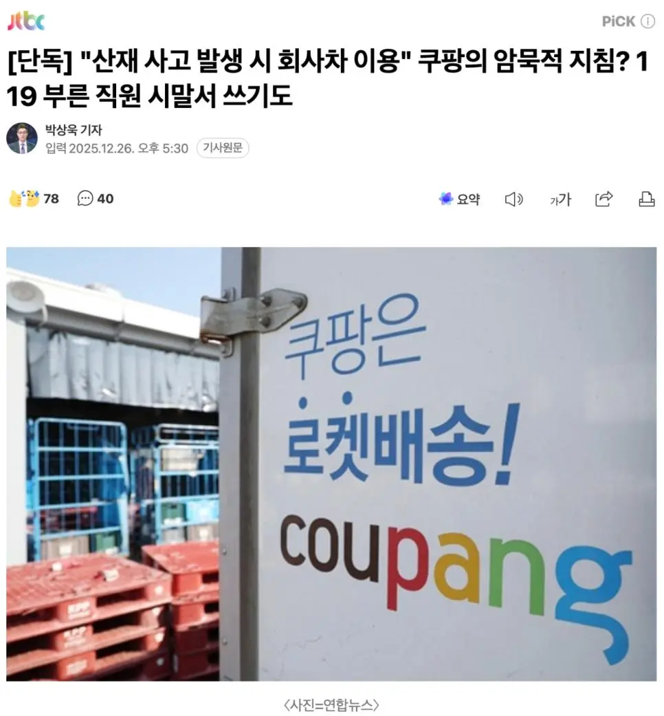 쿠팡이 내부에서 산업재해 사고가 발생했을 때 119로 신고하지 말고 회사의 법인차량으로 병원에 옮기란 내부 지침이 있었단 증언이 나왔습니다.