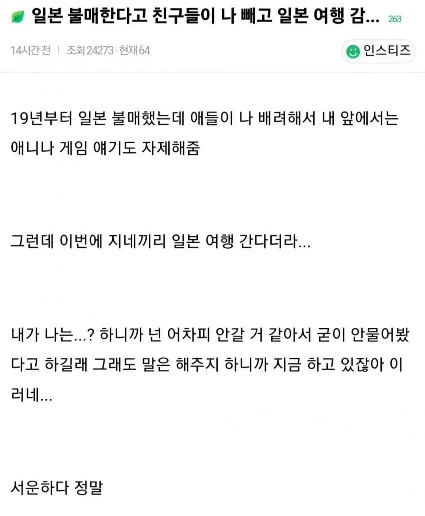 일본 불매한다고 친구들이 나 빼고 일본 여행 감