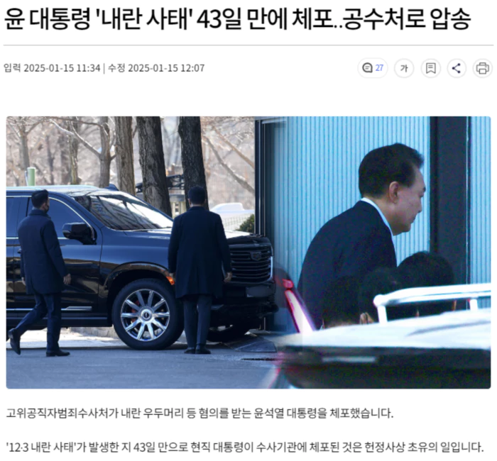 공수처는 오늘 오전 10시 33분 서울 용산구 한남동 관저에서 윤 대통령에 대해 체포영장을 집행하고 신병을 확보했습니다.