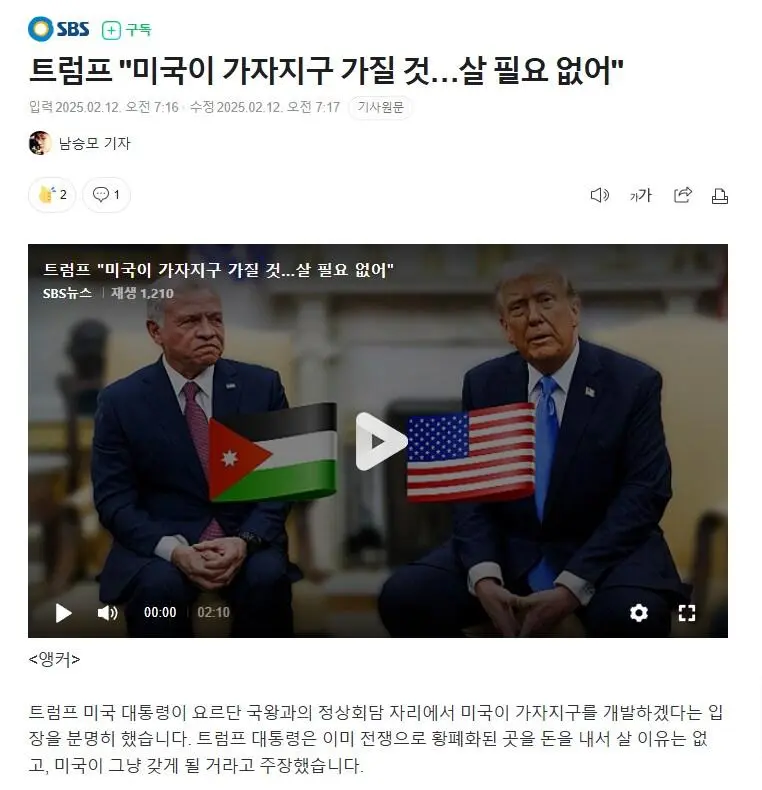 트럼프 "미국은 가자 지구를 돈으로 살 계획이 없다"
