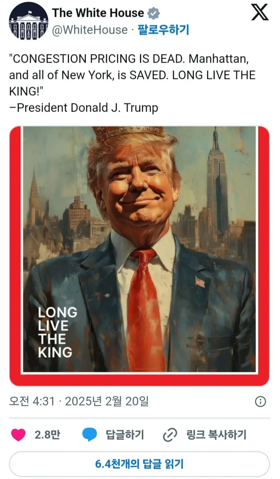 백악관 “국왕폐하 만세” 트럼프 메시지 전해