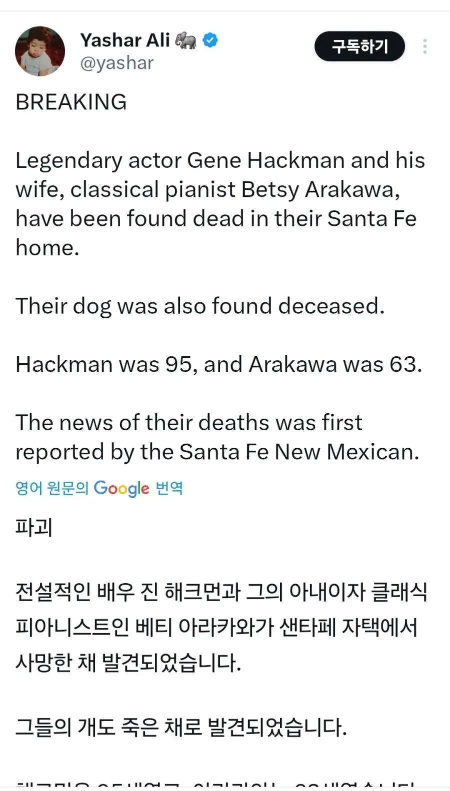 전설적 배우 진 해크먼 가족 전원 사망후 발견됨..