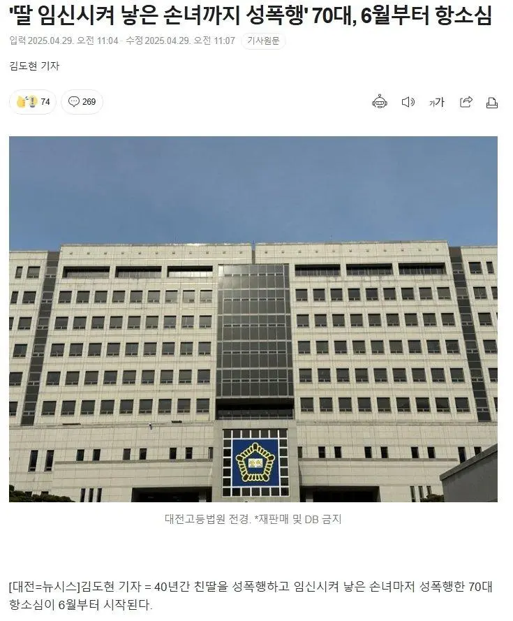 '딸 임신시켜 낳은 손녀까지 성폭행' 70대, 6월부터 항소심.