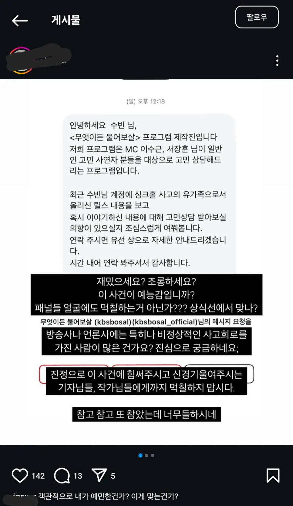 싱크홀 유가족한테 dm보내서 상담해주겠다고....