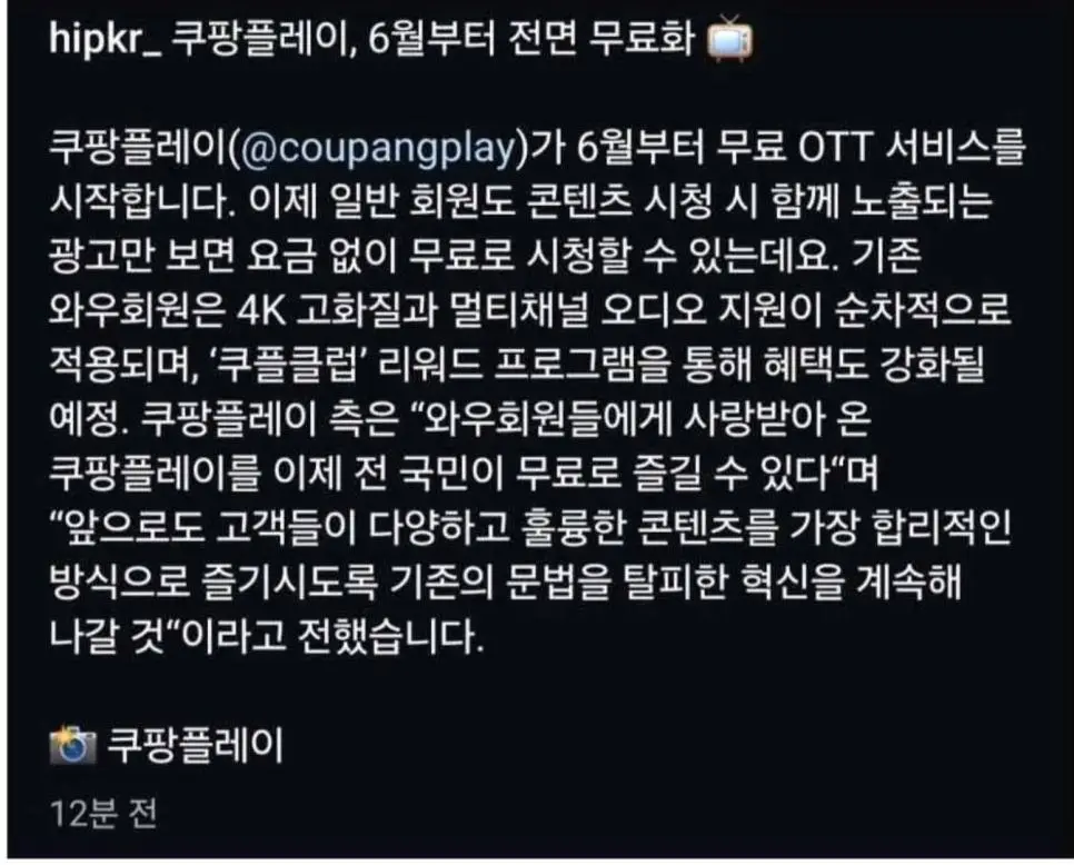 쿠팡플레이 6월부터 전면 무료화 초강수