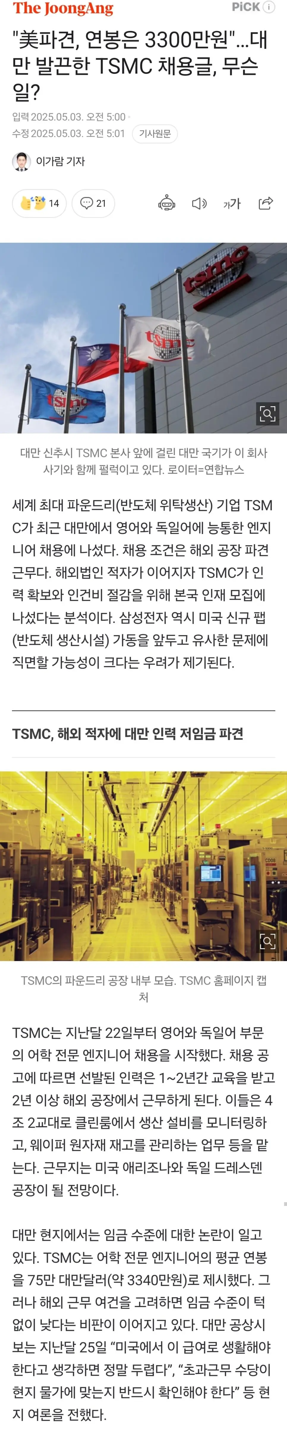 TSMC가 미국 파견직에 연봉 3300만원 내걸었다가 논란