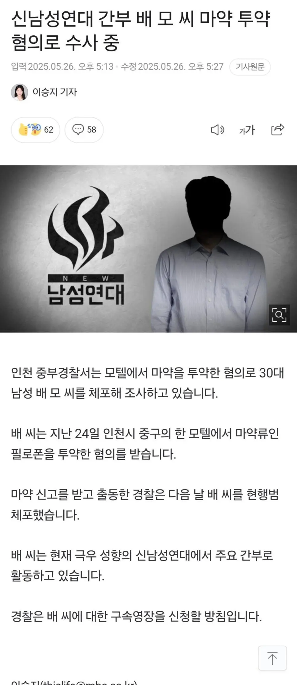 신남성연대 간부 배 모 씨 마약투약 혐의로 수사 중