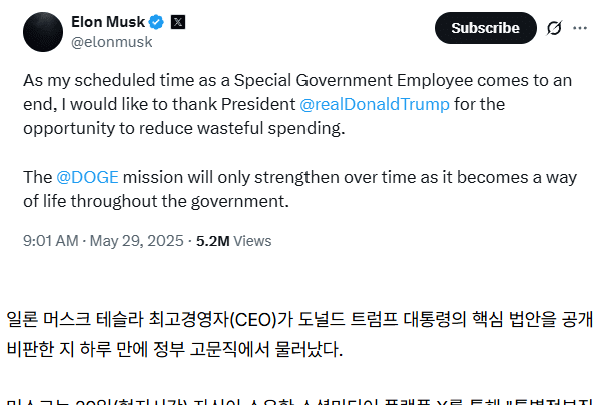 (속보) 일론머스크, 트럼프 법안 디스 후 정부직 퇴사