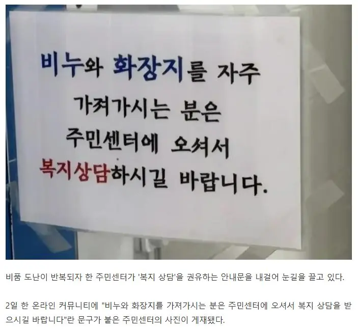 "휴지·비누 가져가신 분, 복지 상담받으세요"…주민센터 공지문 눈길
