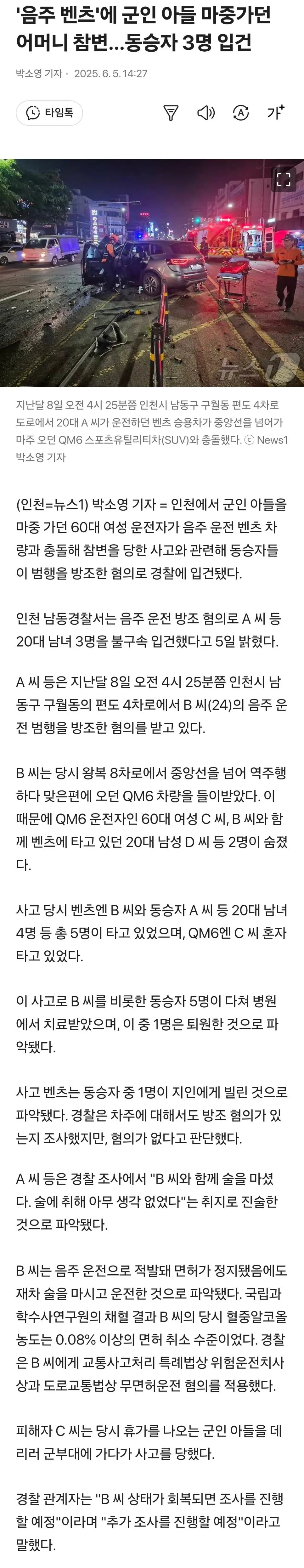 '음주 벤츠'에 군인 아들 마중가던 어머니 참변…동승자 3명 입건