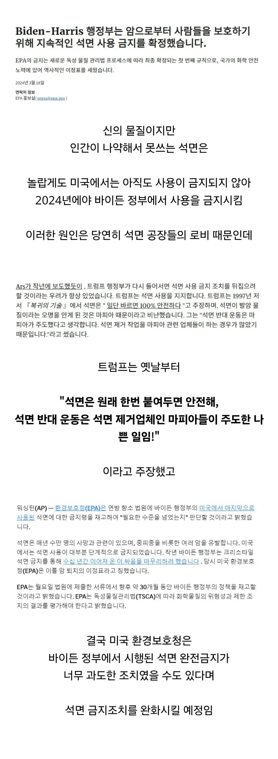 트럼프, 석면 사용 다시 허가할 예정