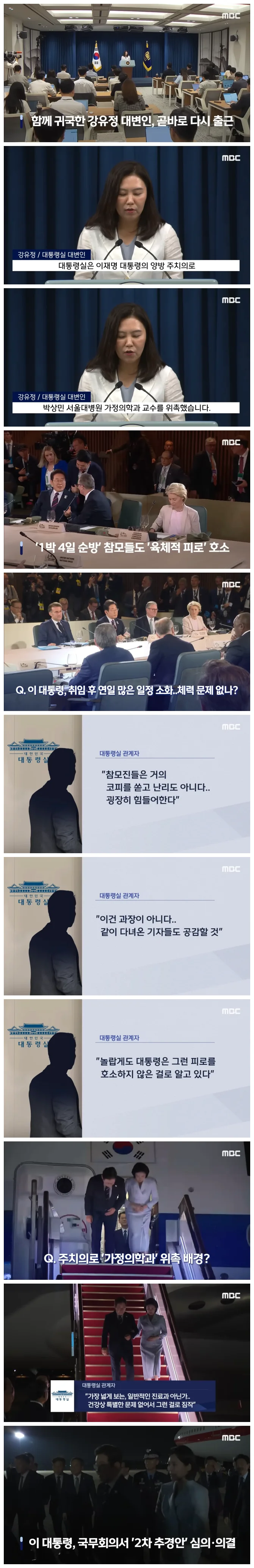 1박 4일에 걸친 첫 순방, 새벽에 귀가하자마자 업무에 복귀한 건데 실제로 이번 순방을 수행한 대통령실 참모들도 상당한 육체적 피로를 호소한 것으로 알려졌습니다.