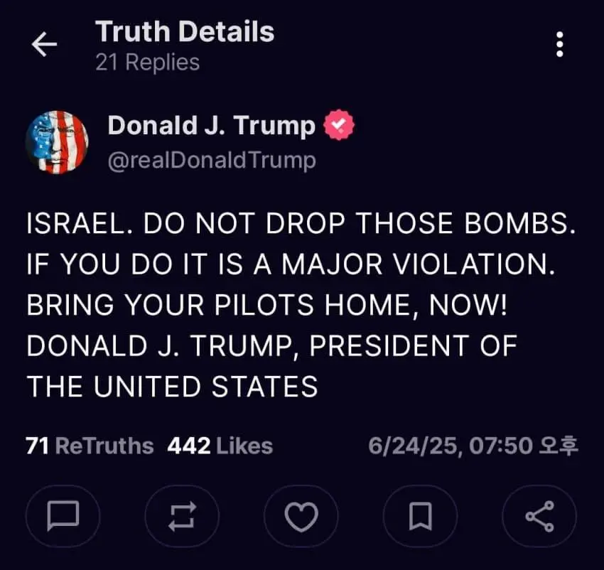 트럼프: 이스라엘님 제발 폭격 좀 멈춰주세욧!!!
