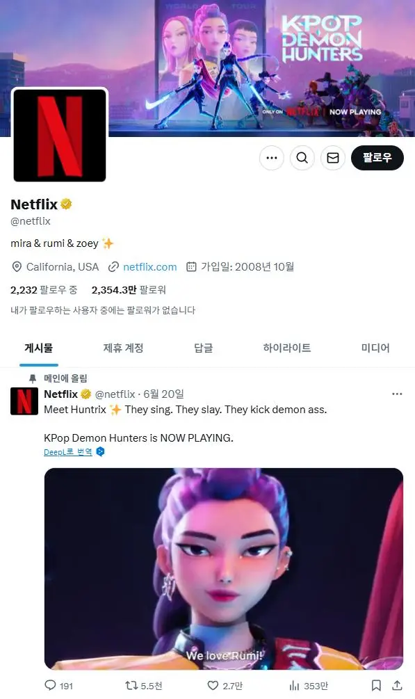 벌써 대박냄새를 맡은 넷플릭스 공식 X 계정 헤더랑 프로필 멤버 이름으로 바꾸고 대문올림ㅋㅋㅋㅋㅋㅋㅋ (현재 모든 국가 무비차트 1~3위 안에 안착한걸로 확인됨) 출처: 더쿠 - 진짜 대박난듯한 케이팝 데몬 헌터스