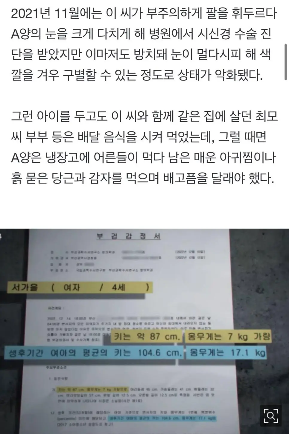 - 사망 당시 4살 아이들의 평균 키(104.6cn)와 체중(17.1kg)을 한참 밑도는 87cm 키에 생후 4개월 아이의 몸무게(7kg)와 비슷한 수치