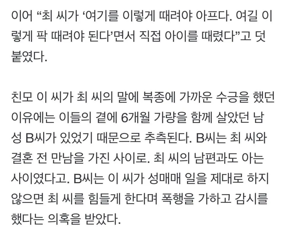(4) 이와중 최씨의 전 남친은 (남편과도 아는 사이) 6개월간 이들과 다같이 동거하며, 친모의 성매매 감시하고 폭행
