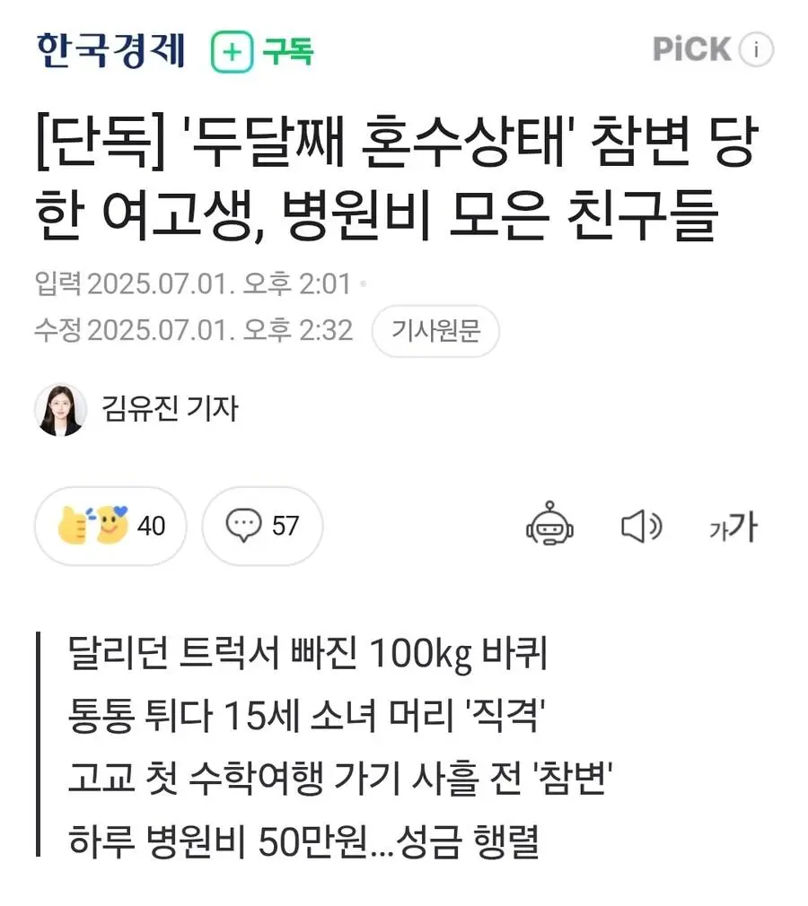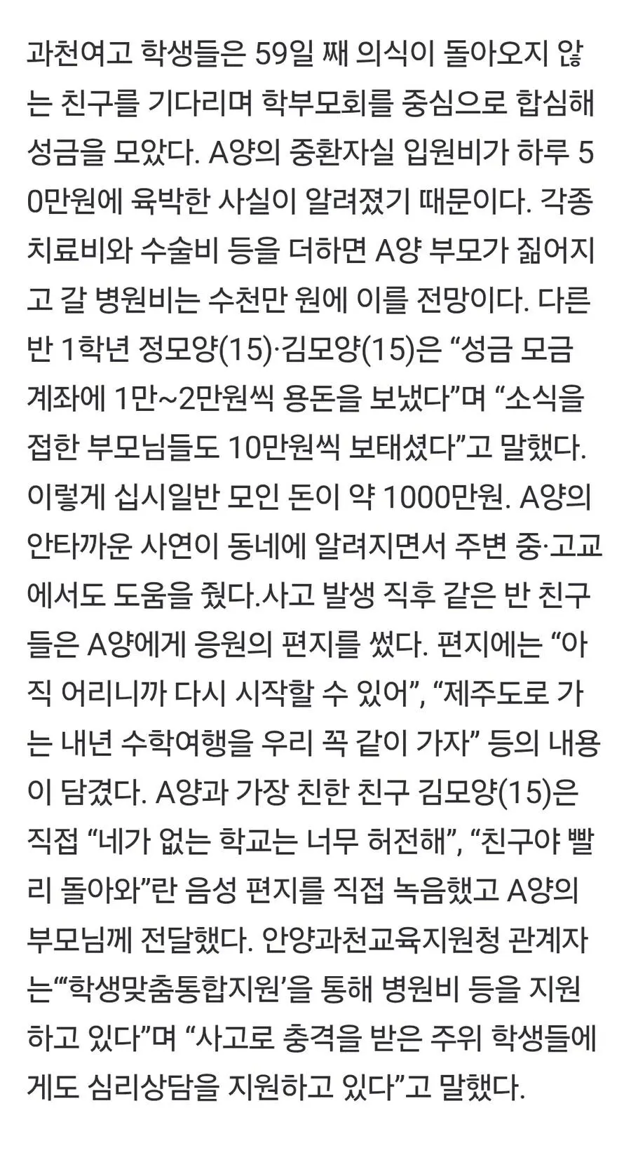 '두달째 혼수상태' 참변 당한 여고생, 병원비 모은 친구들