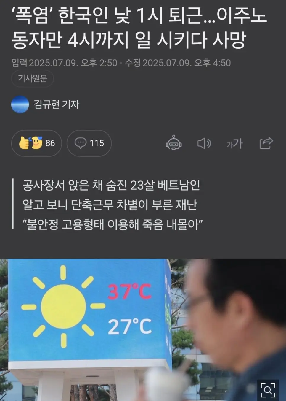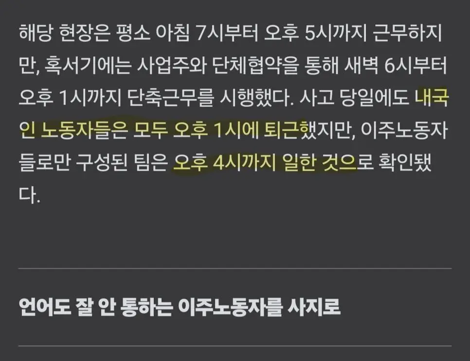한국인은 1시 퇴근, 외노자는 4시까지 일하다 사망