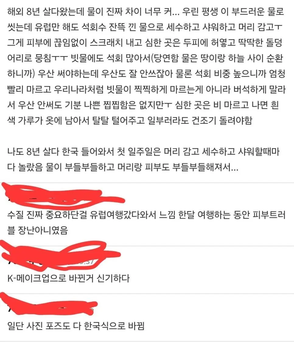 수질때문에 피부 좋아지는것고 큰데