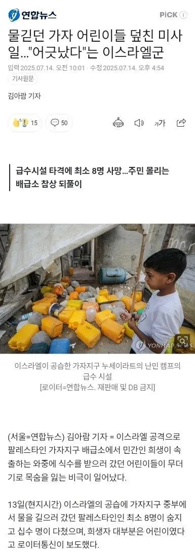 이스라엘이 가자지구 공식 난민캠프의 급수시설을 폭격해 어린이 6명, 성인 2명이 사망하고 17명이 부상당함.