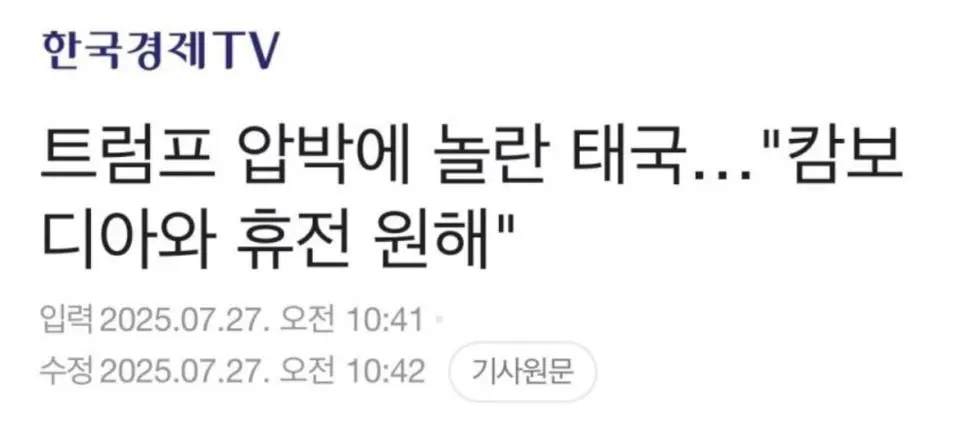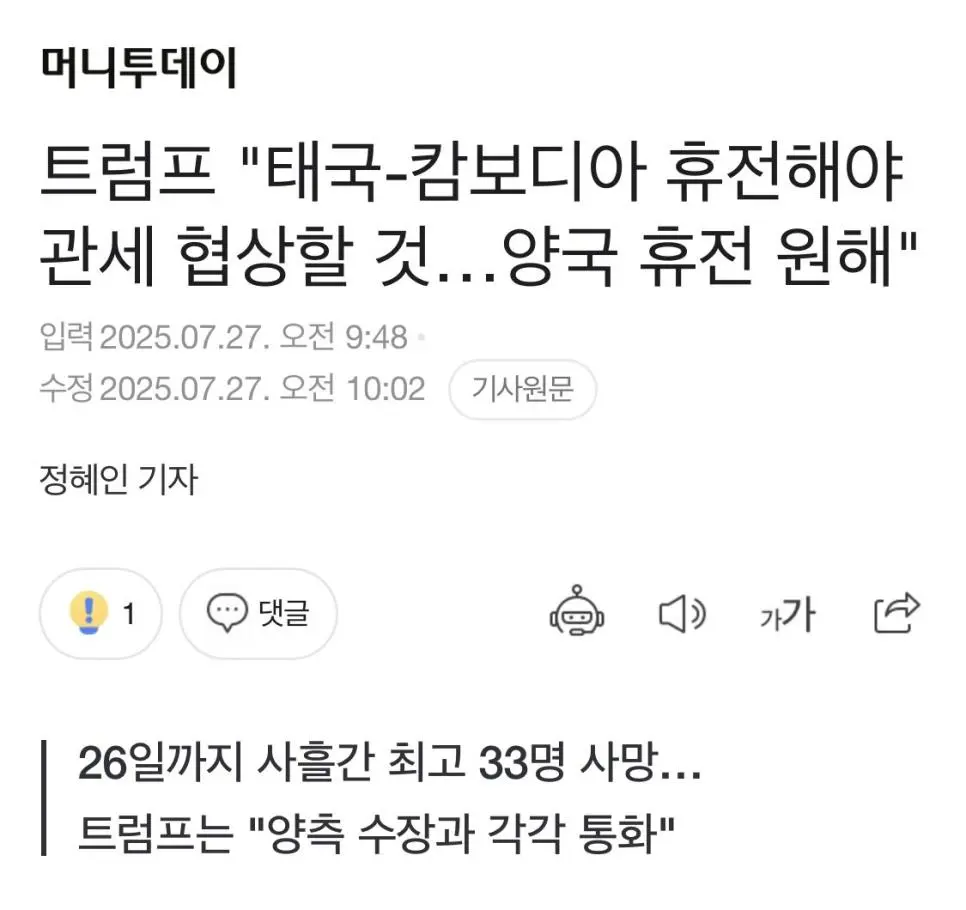 트럼프의 관세협박에 깜짝 놀란 태국 "캄보디아와 휴전 원해"