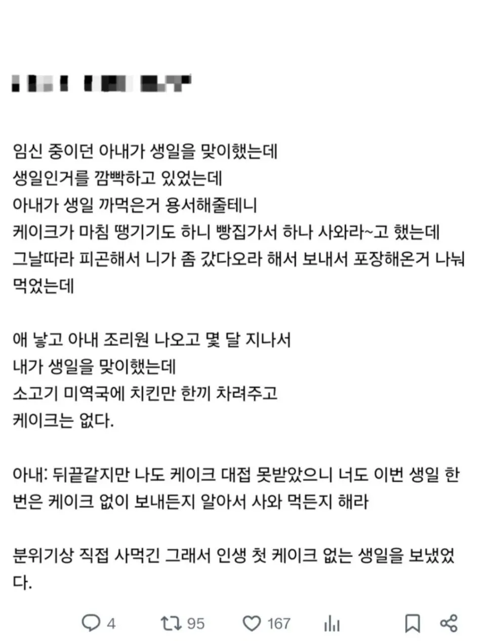 남편 생일인데 케이크 사주지 않는 아내
