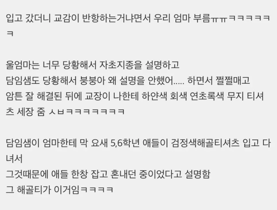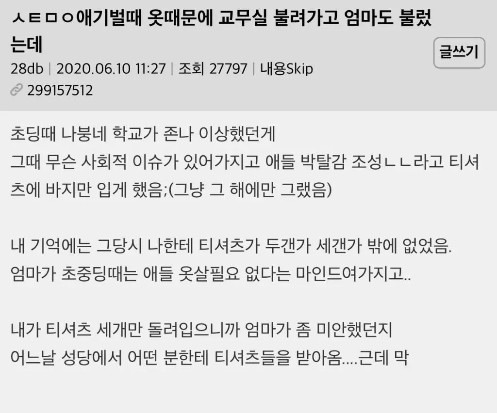 나 초딩때 옷때문에 교무실 불려가고 엄마도 불렀는데..