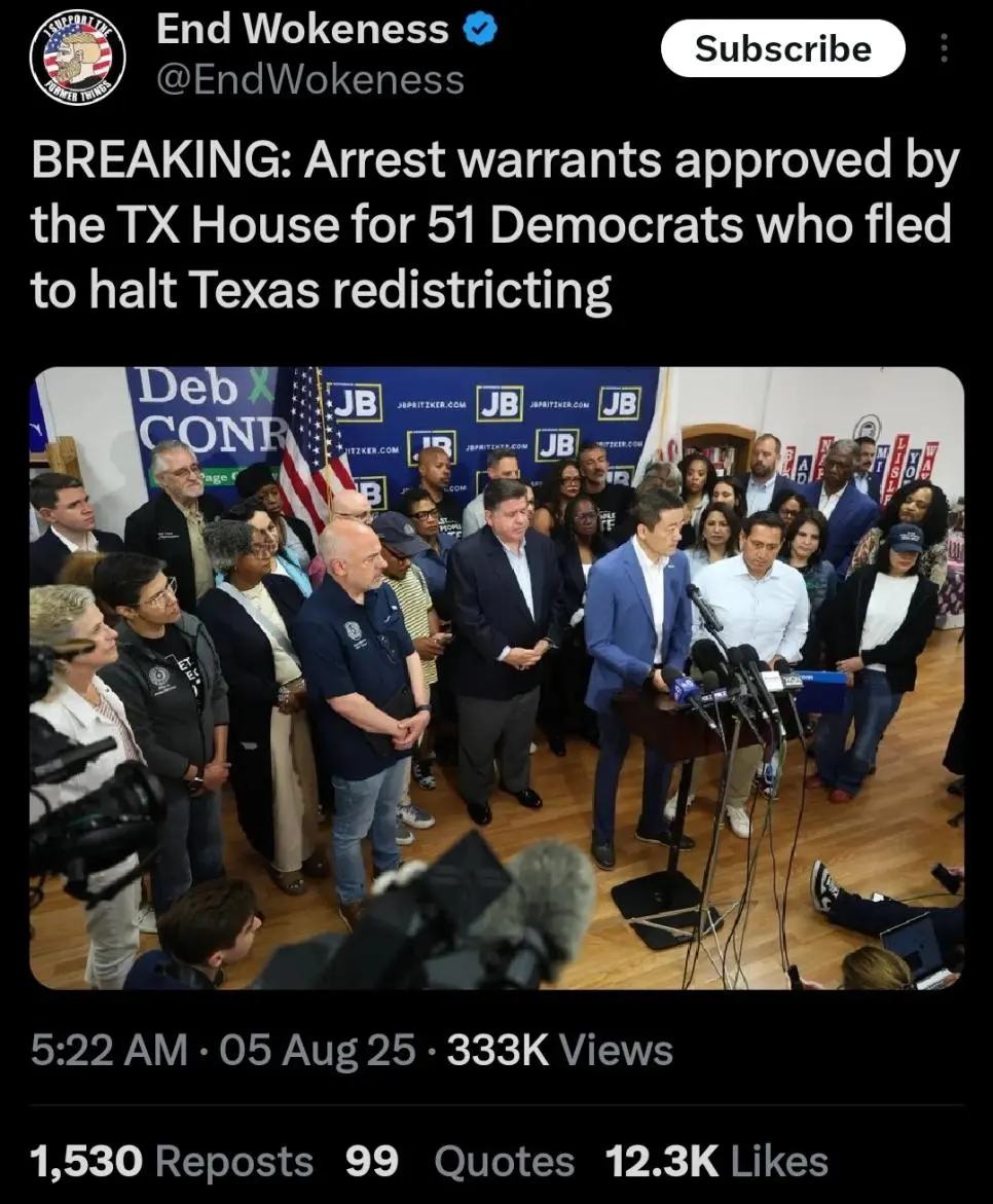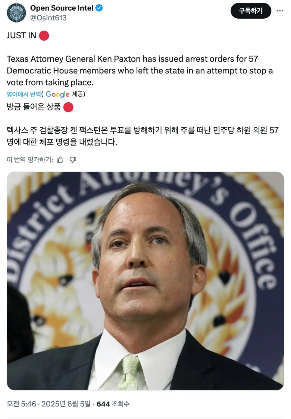 텍사스 선거구 재조정(공화당에 유리하도록) 저지를 위해 도주한 민주당 의원 51명을 검찰 총장이 체포영장 승인 ㄷㄷ