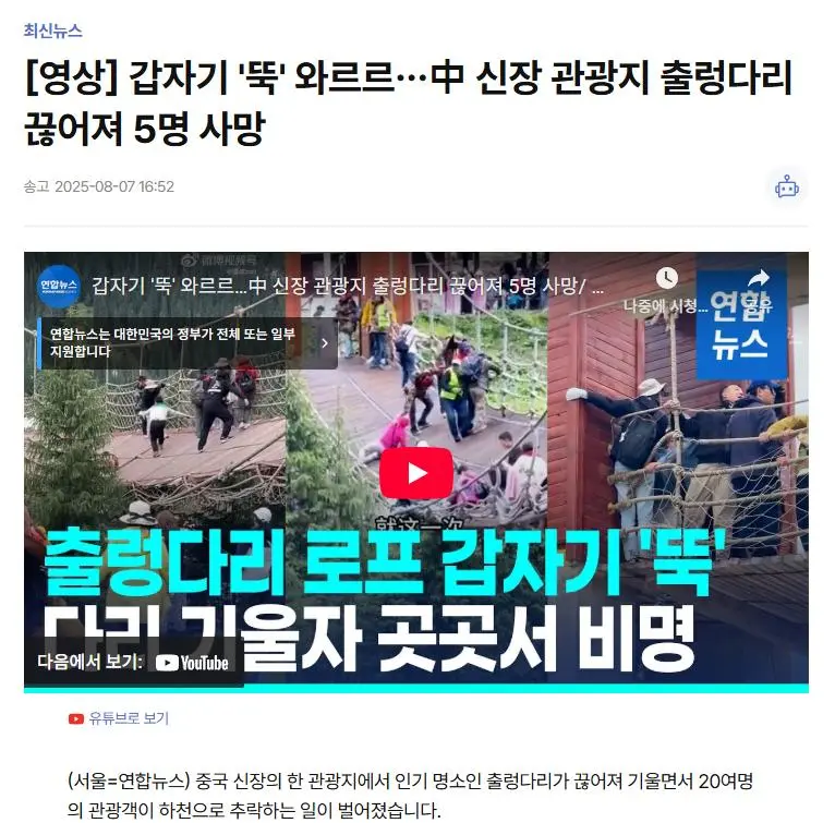 중국 출렁다리 끊어져 20명 추락, 5명 사망