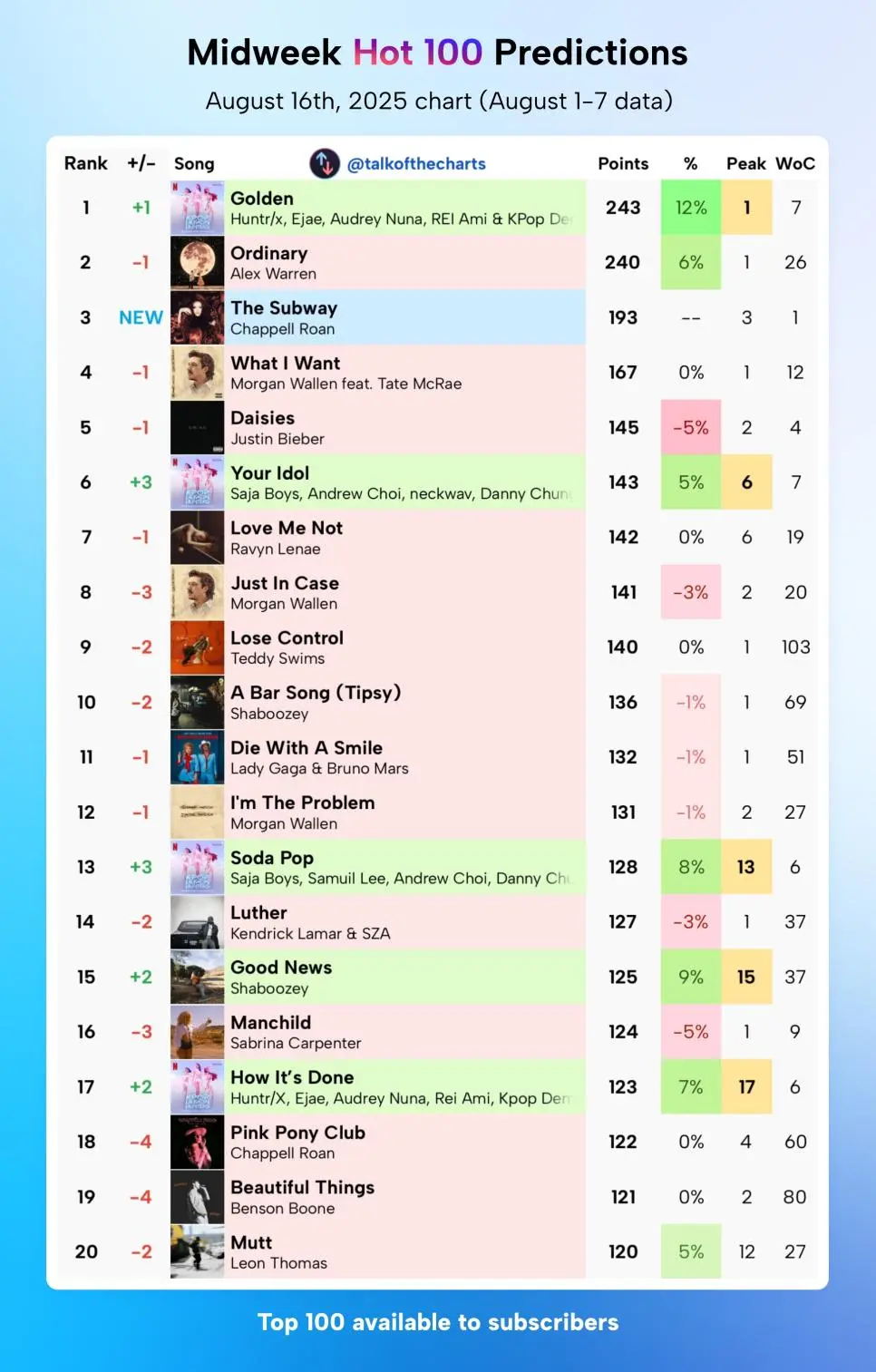 골든, 3점차로 추월…빌보드 핫100 예측 1위(미드위크)