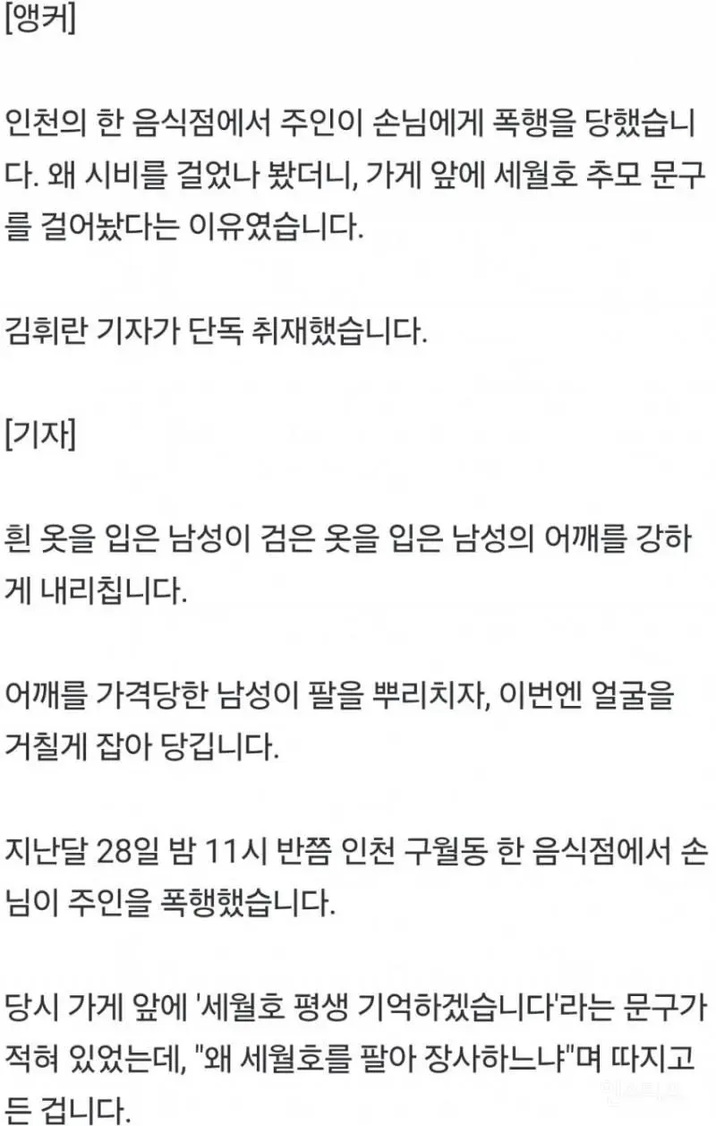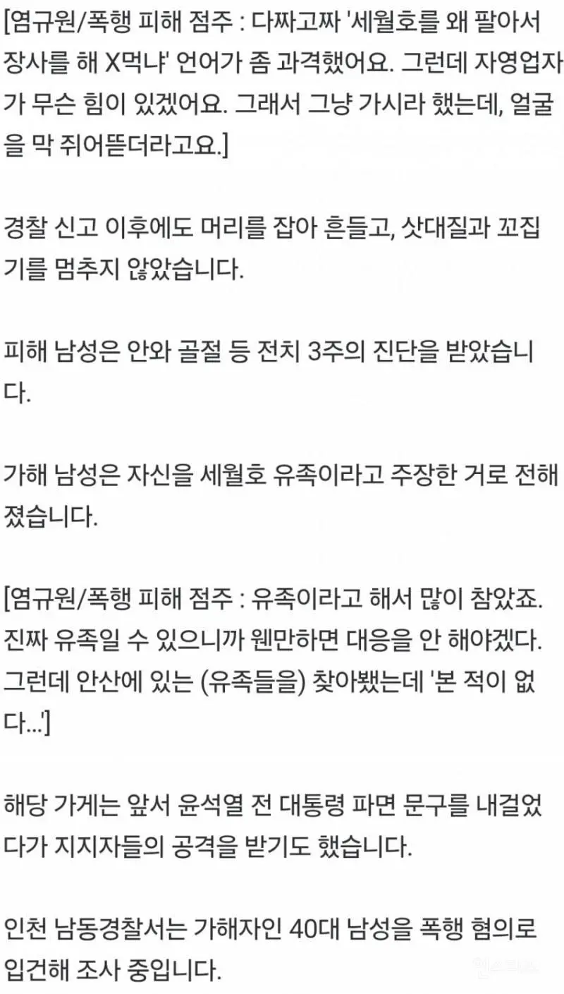 [단독] "왜 세월호 팔아 장사하냐" 다짜고짜 꼬집고 폭행한 손님