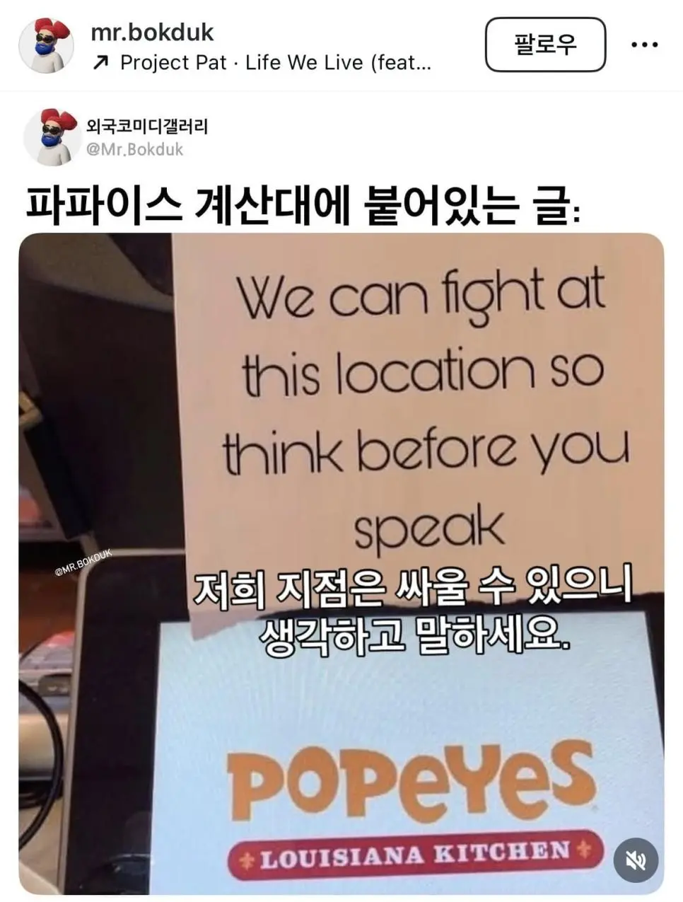외국 파파이스 계산대에 붙어있는 글