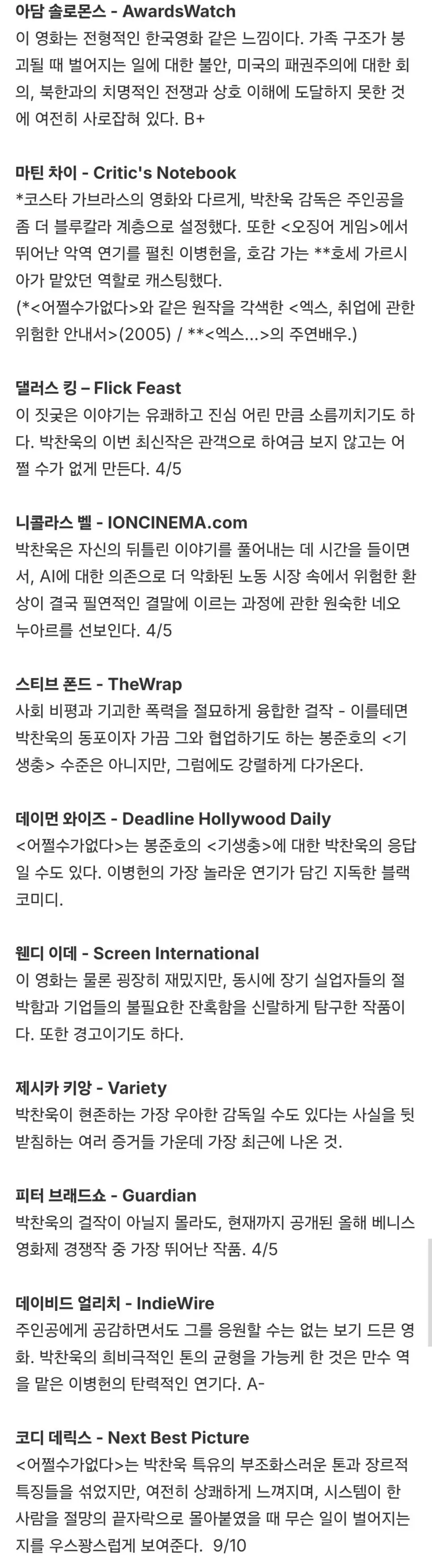 박찬욱 <어쩔수가없다> 초기 반응 모음