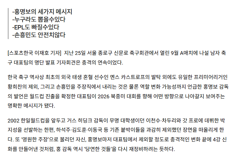 홍명보감독 : 이제 EPL선수, 손흥민이라고 무조건 뽑지는 않겠다.