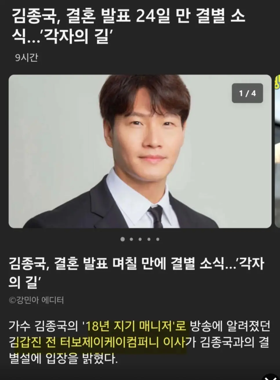 뉴스)김종국, 결혼 발표 며칠만에 결별 소식... '각자의 길'