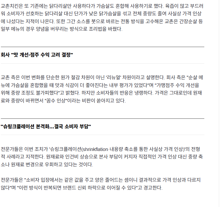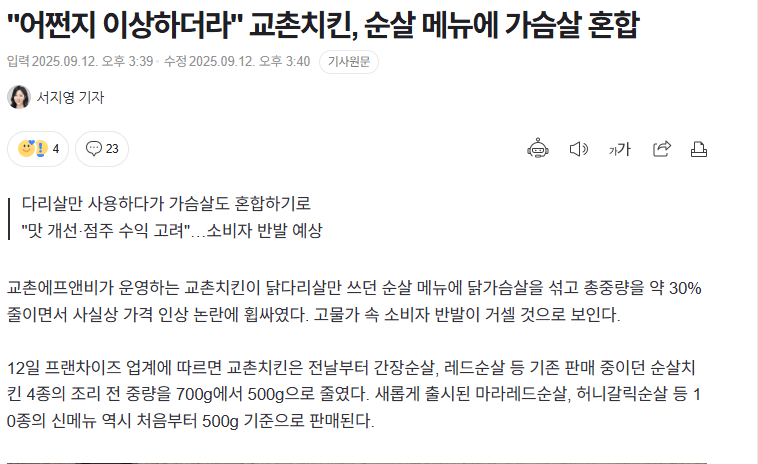 "어쩐지 이상하더라" 교촌치킨, 순살 메뉴에 가슴살 혼합