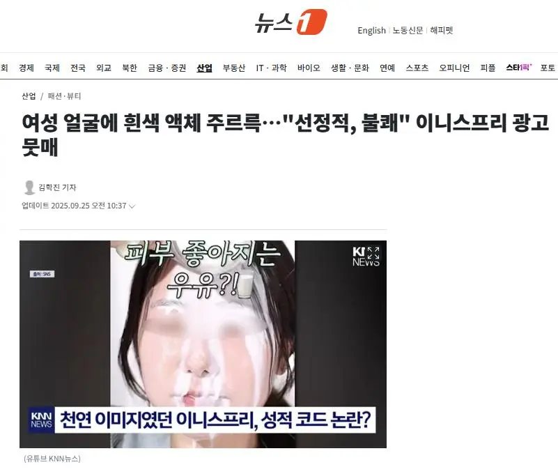 청정한 이미지를 내세운 국내 화장품 브랜드 이니스프리가 신제품 홍보 영상에서 성적 이미지를 연상시킨다는 논란에 휩싸였다. 일부 소비자들의 비판이 이어지자 회사 측은 해당 장면을 삭제하고 사과문을 게재했다.