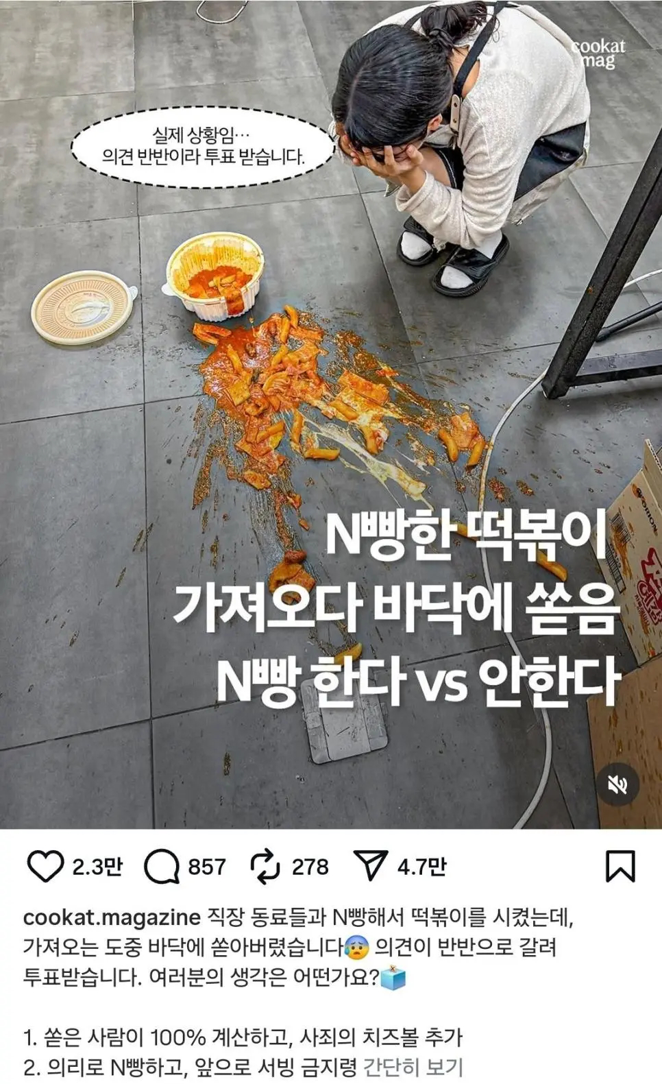 N빵한 떡볶이 가져오다 바닥에 쏟음 N빵 한다 vs 안한다