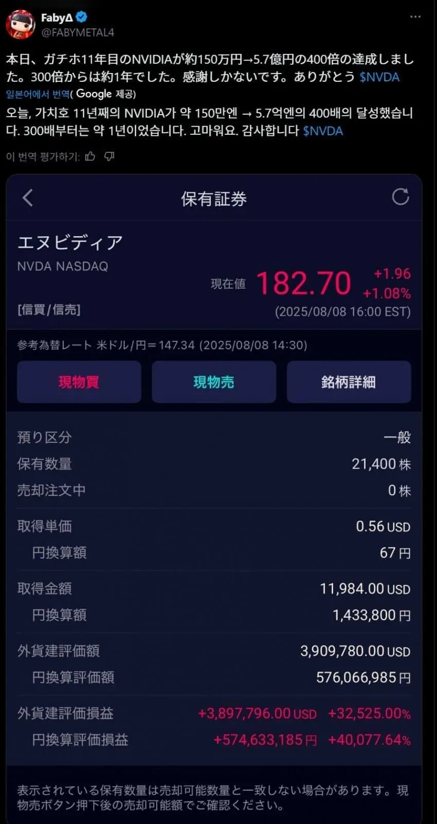 11년 전에 엔비디아에 150만엔 투자 ㄷㄷ