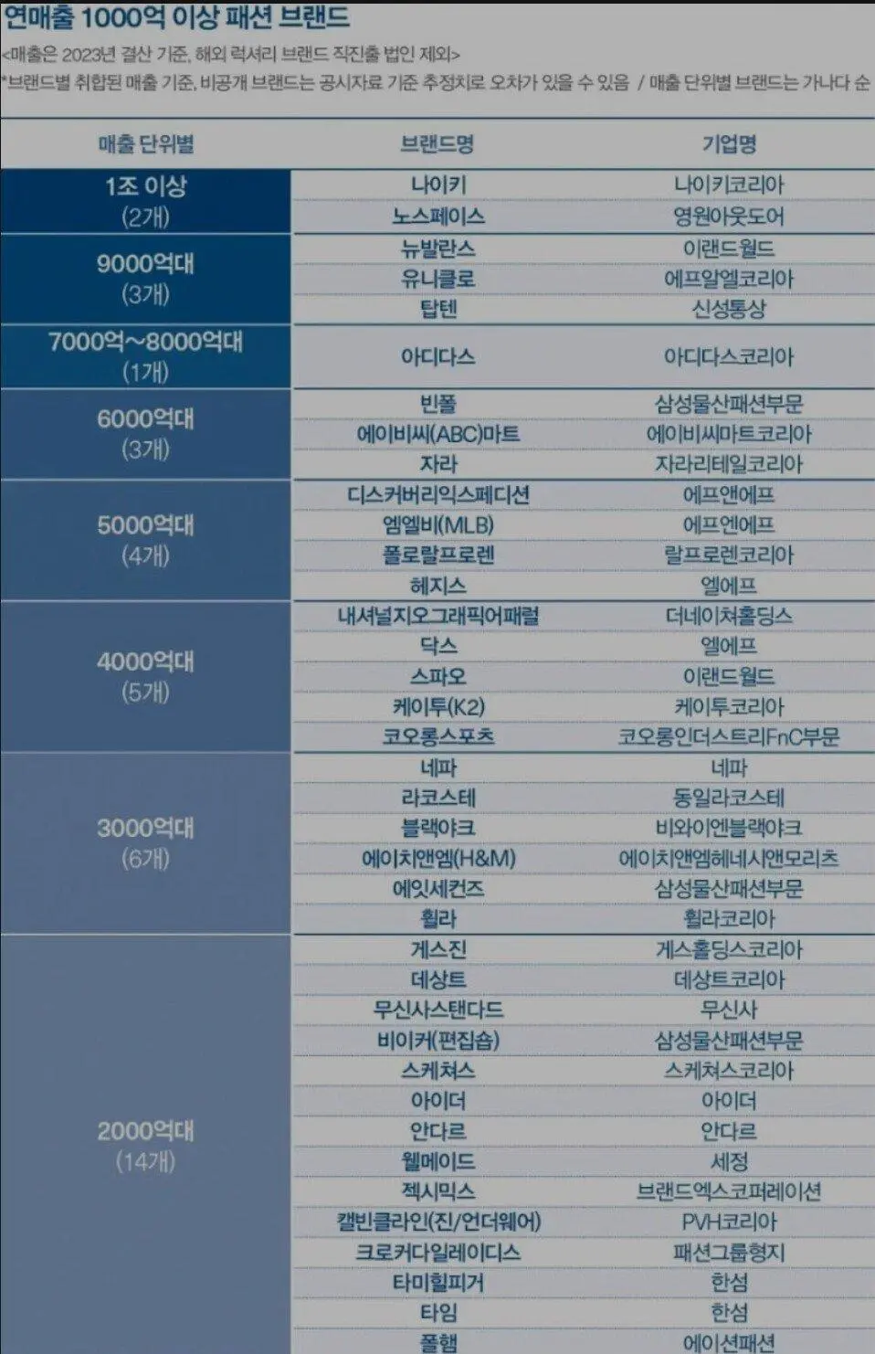 한국에서 매출 1000억 이상 패션 브랜드 순위