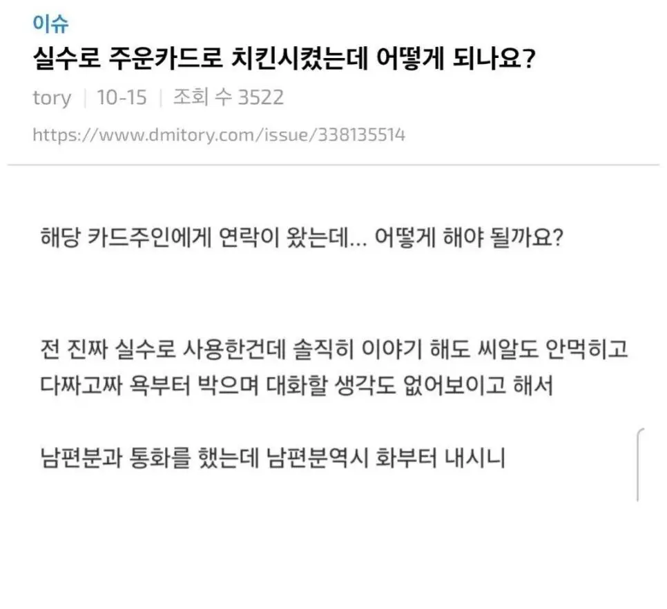 주운카드로 치킨시켜먹었다가 주인한테 연락왔다는 사람