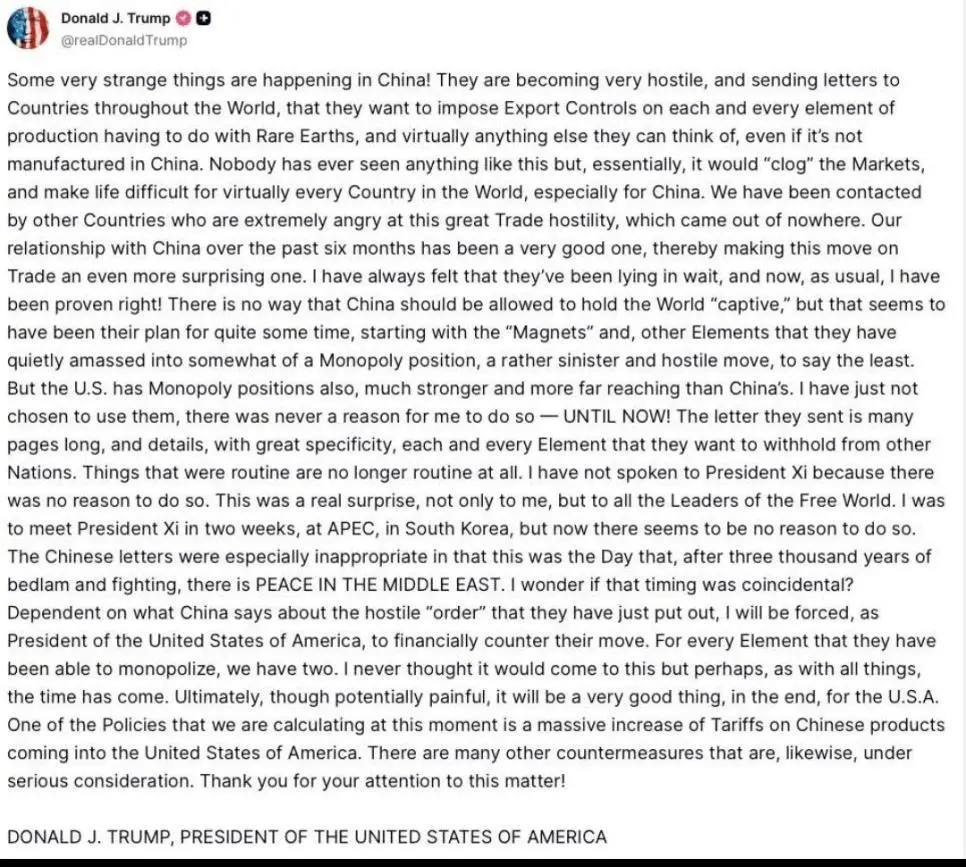 중국에서 아주 이상한 일들이 벌어지고 있습니다! 그들은 매우 적대적으로 변해가고 있으며, 세계 각국에 서한을 보내 희토류와 관련된 모든 생산 요소, 그리고 심지어 중국에서 제조되지 않는 것까지도사실상 그들이 생각할 수 있는 모든 것에 대해 수출 통제를 부과하겠다고 말하고 있습니다.