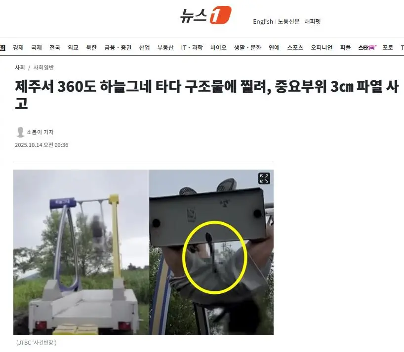한 남성이 제주도에서 360도 돌아가는 하늘 그네를 타다 튀어나온 구조물에 중요 부위가 찢어지는 피해를 봤다.