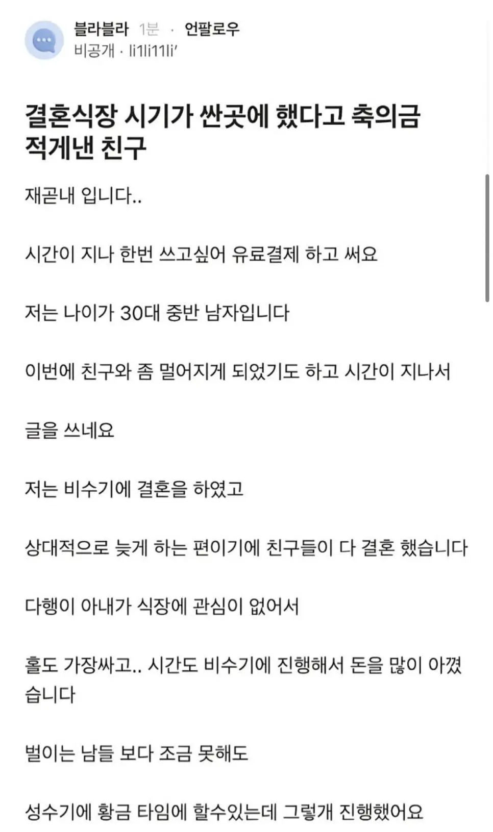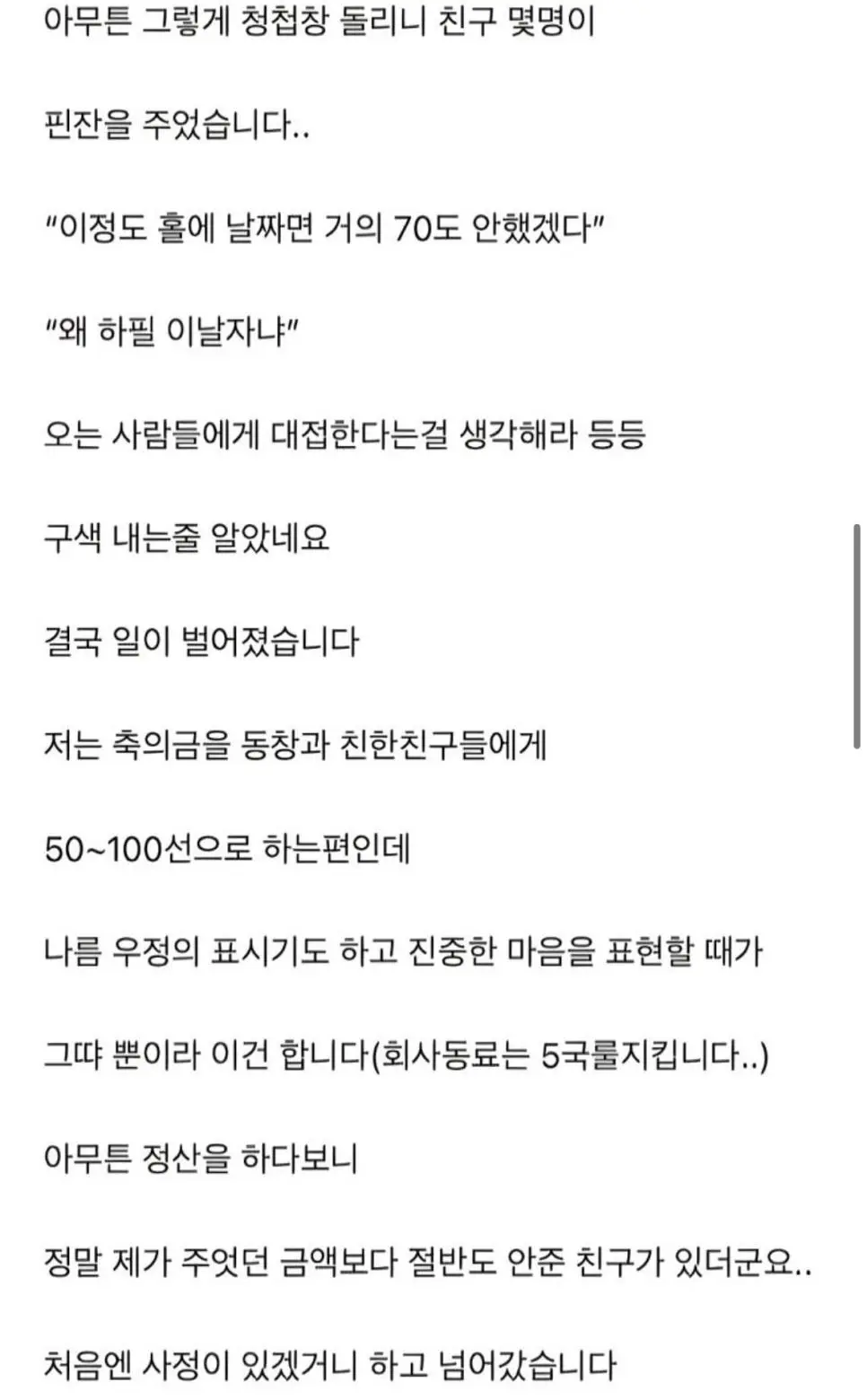 비수기에 결혼 했다고 축의금 적게 낸 친구