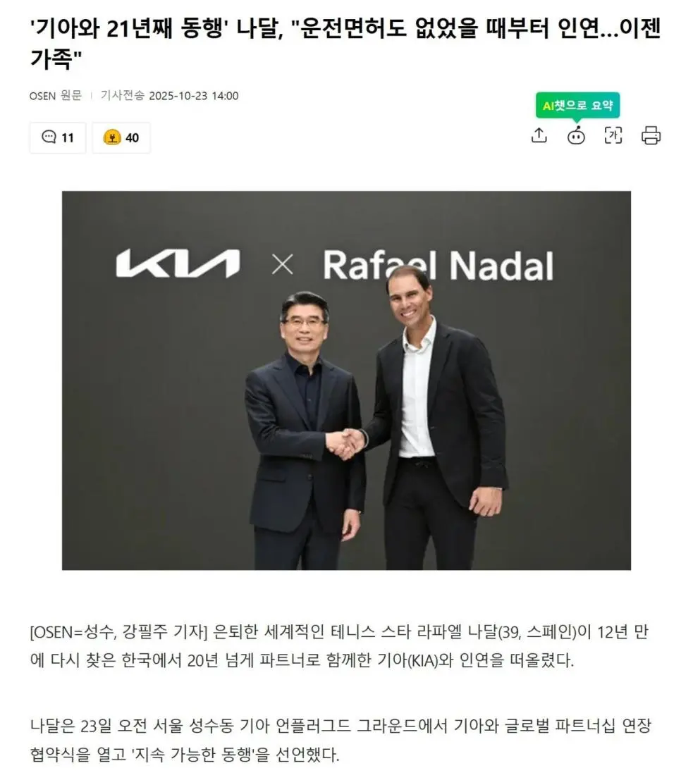 정보) 나달이 16살때(세계랭킹 50위권)처음 스폰서 계약 맺고 04년도 부상으로 은퇴기로에 있었을떄도 추가로 10년 후원계약 맺어줌 ㄷ 기아와 글로벌 파트너십 연장 협약식 ㄷㄷㄷ 21년째하는중 한국온김에 유퀴즈도 촬영예정